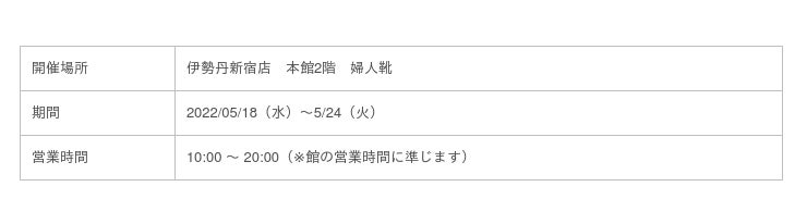5月18日(水)から5月24日(火)まで 伊勢丹新宿店本館2階婦人靴