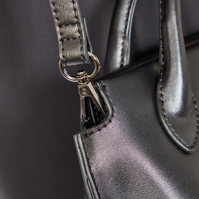 喪服で持つ際に金具が見えない工夫として、ショルダーベルト取り付け金具を使わない時は隠せる位置に配置しました。