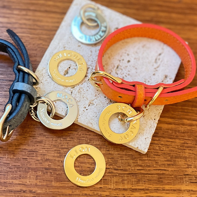 首輪にお名前チャーム専用の金具をつけている為、首輪とお名前チャームをセットでご利用いただくことでよりスタイリッシュにお楽しみいただけます。二つの商品の同時購入でお得にお買い求めできるセット価格をご用意していますのでぜひご活用ください。