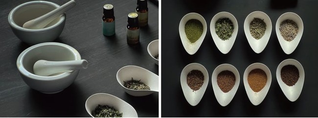 「Yohaku」のアイコンでもある4種のブレンドオイル。これらのオイルと、白檀、桂皮、ラベンダー、和ハッカなど、10種の天然の香原料を調香師が開発したレシピにのっとり掛け合わせフレグランスバッグ作りをお楽しみいただけます。お客様のお好みで原料の足し引きのアレンジも出来ます。香原料のなかには、茶の名産地である嬉野らしく、副島園産の煎茶「さえみどり」といった珍しいものも。