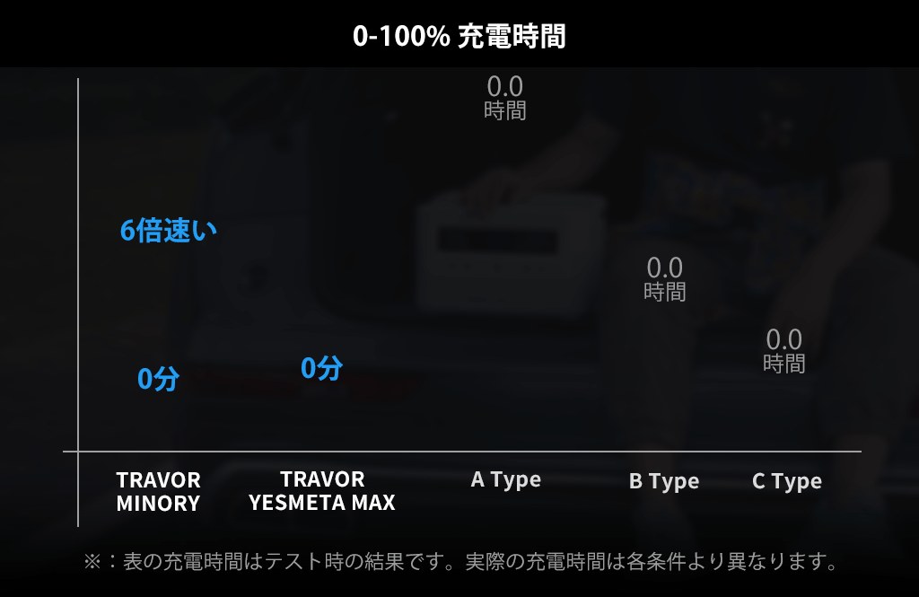 他社が充電時間に7.5時間近くかかっている中、6倍も速い最速70分でのフル充電が可能です。TRAVORは、AEEC特許取得済みの高速充電技術を採用しており、充電速度を従来の200%も向上させています。0%から80%まで充電するのにわずか45分しかかかりません。70分でフル充電され、通常よりも60%程度時間が節約できます。キャンプをするときも、長距離運転の準備をするときも、裏庭で日曜大工をするときでも、TRAVORは、あなたの大切な時間を節約できます。
