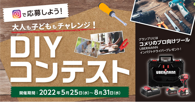 ホームセンターの「コメリパワー」や「コメリハード&グリーン」を通し地域のライフラインとして、地元のプロを応援する株式会社コメリ(所在地:新潟県 新潟市、代表取締役社長:捧雄一郎)は、2022年5月25日(水)から8月31日(水)までの期間でInstagramにて応募できる「大人も子どももチャレンジ!DIYコンテスト」を開催いたします。