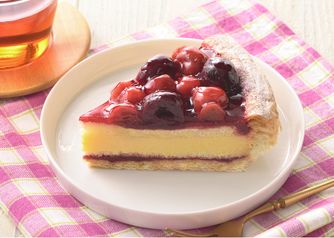 風味豊かなパイにカスタードを重ねて、爽やかな酸味の"レッドサワーチェリー"と、濃厚な甘みの"ダークスイートチェリー"をたっぷりのせました。チェリーのジューシーな果肉感&甘ずっぱさと、パイ、カスタードが相性抜群!