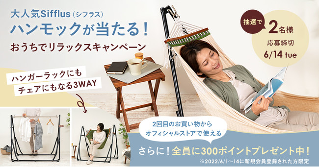 暮らしにイロドリとプラスの価値を創造する製品・サービスを提供するライフオンプロダクツ株式会社(本社:大阪府大阪市、代表取締役:池田祐一)が運営するオフィシャルストアにて【大人気Sifflus(シフラス)ハンモックが当たる!おうちでリラックスキャンペーン】を2022年6月14日(火)まで開催中。