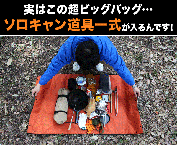 新発想の超ビッグバッグにはソロキャンプの用品が(一式全て)入り持ち運びが可能です。応援購入者様のコメントでは「キャンプの時に荷物を運ぶ車との往復回数が減るため嬉しい!」とのご意見も頂いております。