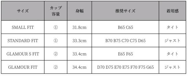 サイズ:SMALL FIT/STANDARD FIT/GLAMOUR S FIT/GLAMOUR FIT