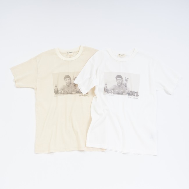 リサが、「ねこを抱くスティーナ」・「Lilla zoo cat」・「マイキーのパパ」など、自身の作品に囲まれたポートレートがプリントされたデザイン。リサの肩に乗っているのは、彼女が飼っていた猫。リサのTシャツには珍しい写真プリントはラフに着こなせるのに子供っぽくならないので、幅広い年齢のかたにおすすめです。