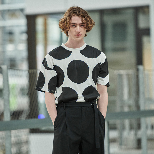 直径9インチの黒いドットを等間隔に配置した長袖シャツです。ドットのサイズは4インチ(白地/黒ドットで裾に黒地切り替えのデザイン)と、9インチ(白地/黒ドット)の2種類があります。