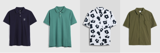 左から:GAPミニアーチロゴ ピケ ポロシャツ ¥4,490、ソフトポロシャツ ¥3,990、シアサッカーシャツ ¥5,990、FREE&FLOW ナイロン オーバーサイズ シャツ ¥7,990