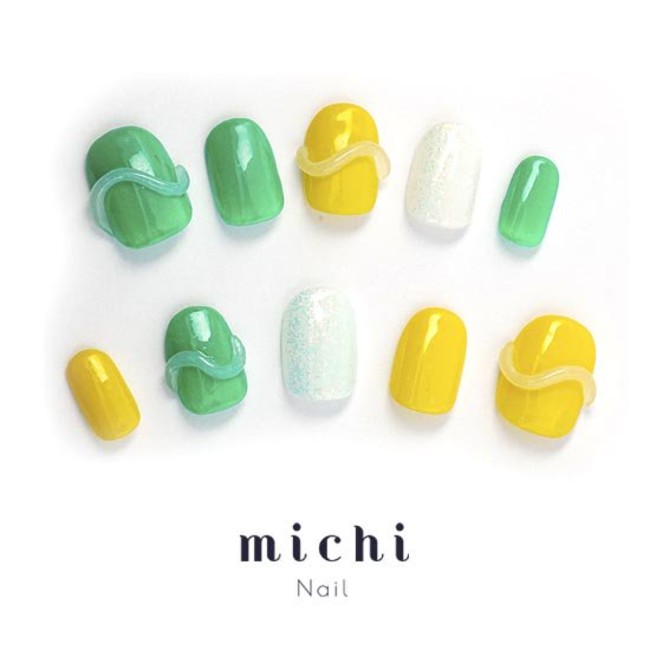 今期のトレンドカラーのグリーンやイエローを大胆に使ったこちらのネイル。韓国で話題のうねうねデザインです。ビタミンカラーのネイルは、個性的で元気な印象を与えてくれます。