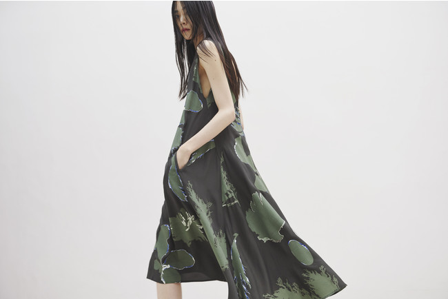 斜めに走る線から落ちる柔らかなドレープがつくる、女性らしくリラックスしたドレススタイル。葉や貝などのモチーフが剥がされシルエットだけが残ったようなプリントは、ナチュラルなモチーフが「輪郭」や「跡」で構成され、コンテンポラリーに表現された2022プレフォールのシグネチャー。