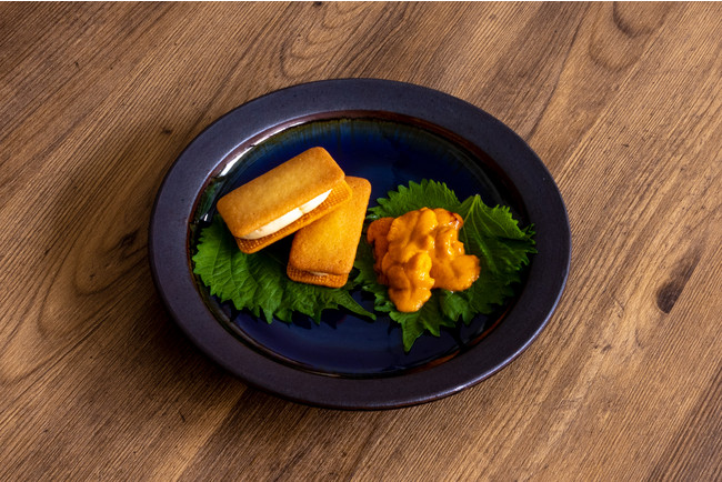 生うにを醤油や味醂と混ぜて低温調理したうにソースをバタークリームに練り込んで、ザクザクのサブレでサンドしました。ふわっと香る生うにの風味、サブレの香ばしさにうにソースの醤油の風味が混ざり合って一体感を生み出して、うにソースの塩味が全体の味をまとめ上げています。うにを低温調理することでクリーミーな風味を残しながらもスイーツと自然にマッチする