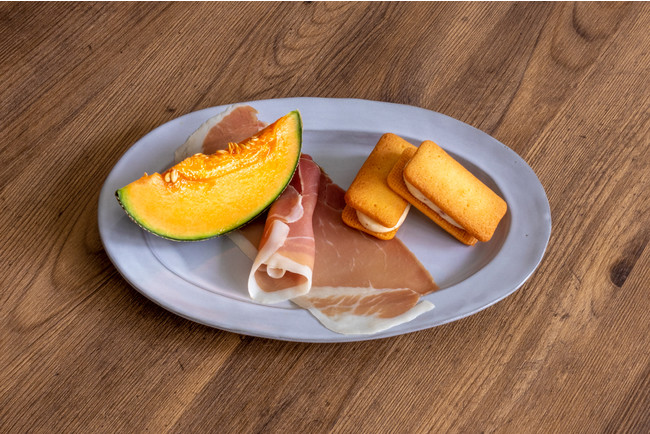 イタリア産9ヶ月熟成のプロシュート(生ハム)と赤肉メロンをバタークリームに練り込んで、ザクザクのサブレでサンドしました。メロンの優しい風味にプロシュートの熟成香がすっきりとしたバタークリームにコクを与え、9ヶ月熟成生ハム独特の塩味がアクセントに。プロシュートを細かく刻むことで塩味よりも熟成香がふわっと感じられ、メロンも素材そのままのほのかな香り。サブレの甘みと組み合わさることで一つの料理として完成された味わいです。