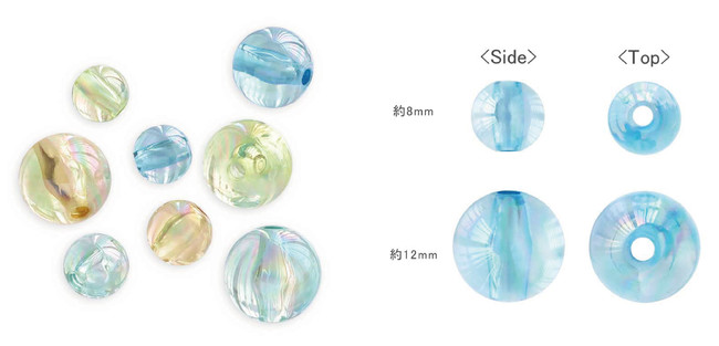 光の入り具合でキラキラと色味が変化するオーロラカラー加工を施した、アクリル素材の丸玉ビーズパーツです。