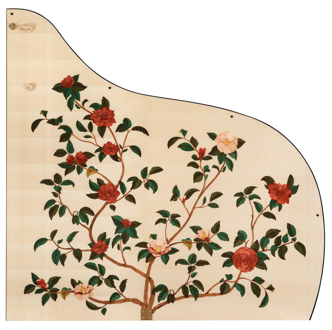 グランドピアノの屋根の内側に、異なる種類の木を使用したヨーロッパの伝統的な象嵌細工の技法による繊細な装飾を丁寧に施し、華やかな仕上がりと気品のある佇まいを実現しました。屋根の内側に描かれているデザインは、世界文化遺産・シェーンブルン宮殿の庭園にある大温室「パームハウス」で栽培されている椿の花から着想を得たものです。色付けした木材に焼いた砂で焦げ色をつけて陰影をつける伝統的なサンドシェーディング技法を用いて、細部まで美しくデザインされたピンクや赤のカメリアの花を優雅に表現し、鮮やかな立体感を演出しています。