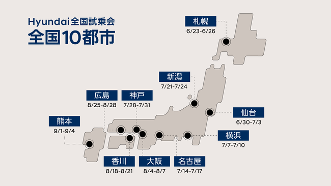 そして今回、各地域のお客様よりいただいたご希望の声にお応えし、6月から9月にかけて札幌を皮切りに、全国10都市※(札幌、仙台、横浜、名古屋、新潟、神戸、大阪、香川、広島、熊本)での試乗会を新たに開催決定いたしました。5月2日(月)より販売開始した「IONIQ 5」、「NEXO」をより多くの方々に体験いただきたいと考えております。