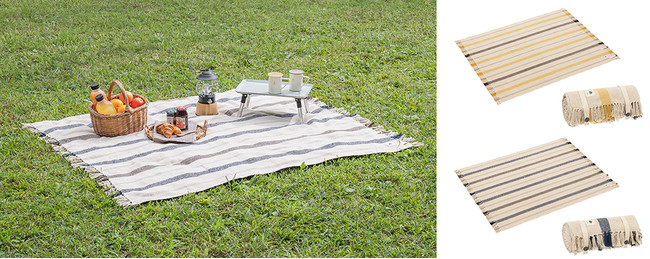 あたたかな季節のデイキャンプやピクニックでは、地面に敷いて使用するのに最適なほか、肌寒い季節にはひざ掛けなどとしても使用できます。アウトドアシーンはもちろん、おうちの中でも馴染みやすいネイビーとイエローの2色展開で、インテリアとしても活躍します。