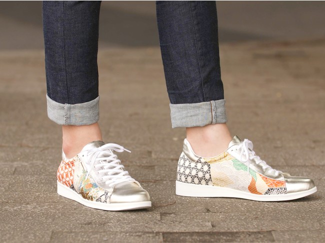 浅草の靴職人の技で、美しい着物と本革スニーカーを融合させたユニセックスの「着物×本革スニーカー」です。