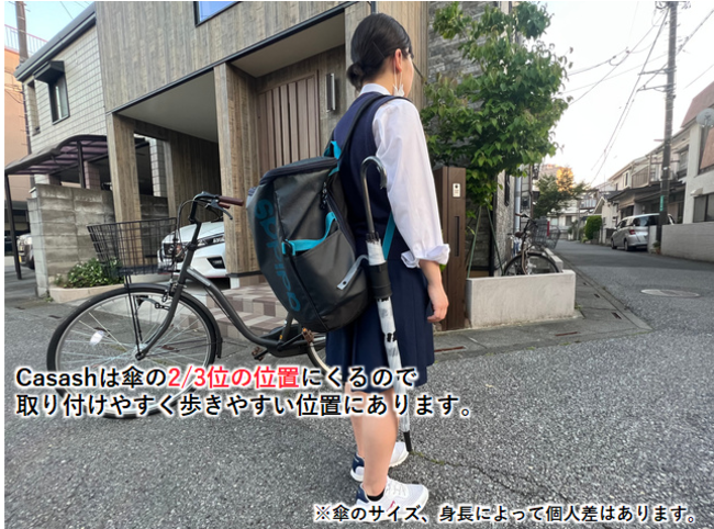 Casashを使うと、リュックやカバンに傘を簡単に取り付けることができ、手ぶらでの移動が可能になります。