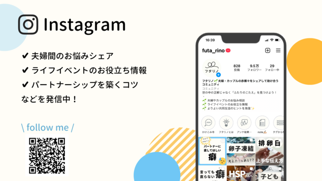 公式Instagramでは、ふたりの生活に役立つ情報を配信しています。「みんなはこんなときどうしているのだろう?」といった、パートナーシップに関するお悩みなど、匿名でのご相談も承っています。