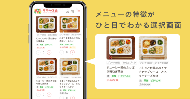 また、栄養素の特徴のみでなく、メニューごとにどのライフステージの方におすすめかをママの休食がレコメンド。迷ったときは「プレママ向け」「育児ママ向け」「お子さま向け」「からだづくり」からご自身のライフステージにあわせてお選びいただけます。