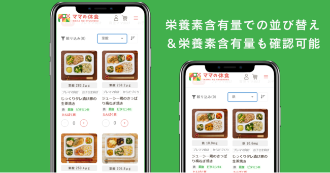 エネルギーやたんぱく質、食塩相当量のみでなく、ママが気になる「葉酸」「鉄」の含有量でも並び替え可能。栄養素量で並び替えた際には、一覧上に該当の栄養素含有量が表示されます。