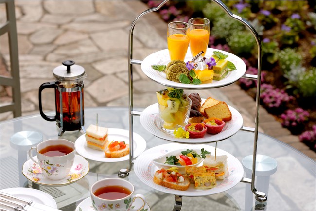ピスタチオのガトーやマンゴープリン、フレッシュトマトとモッツアレラチーズのオープンサンドなどをはじめとするスイーツやセイボリーが盛り合わせたケーキスタンドとカメリアズティーハウスロンドンの紅茶を含むソフトドリンクをフリーフローでお愉しみください。