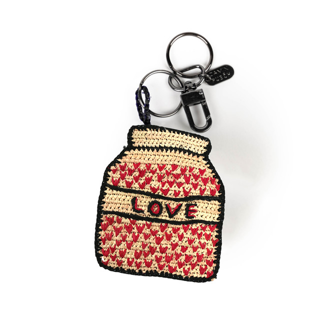 ブランドの人気アイテム、キーチャームのコラボレーション商品も登場。たくさんのハートが詰め込まれたボトルを模ったキーチャームは、“MORE”と“LOVE”の文字が表と裏に刺繍されています。
