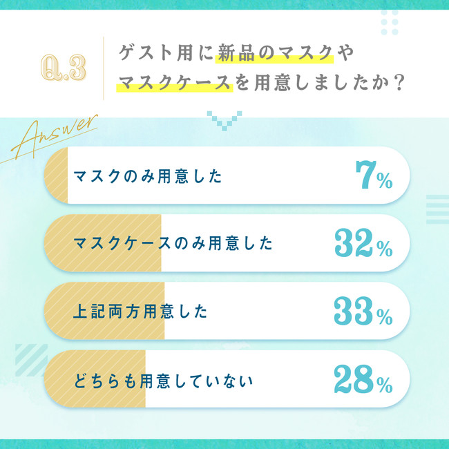 ゲスト用のマスクやマスクケースに関しては、両方を用意する人が33%、マスクケースのみを用意する人は32%で、約7割がマスクやマスクケースを用意していました。また、65%がマスクケースを用意していることがわかりました。コロナ禍の結婚式では、マスクのマナーとして、式場がマスクケースを用意している場合も多いようです。