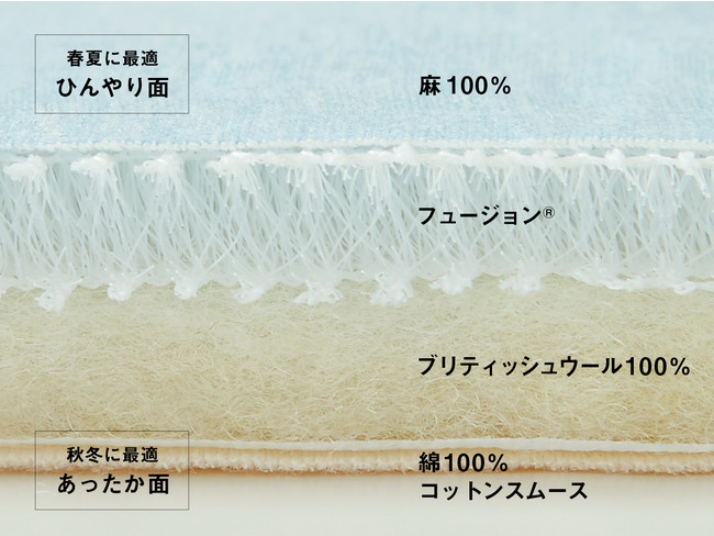独自の4層構造でわずか約1.5cmという薄さ。夏は涼しく冬あたたかい4層リバーシブル構造。