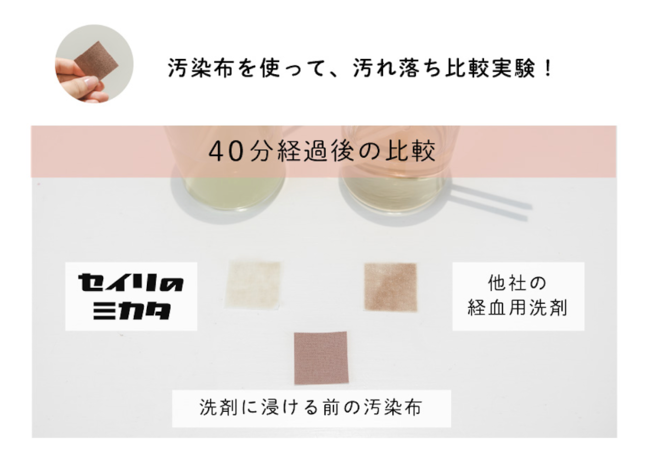 「セイリのミカタ 経血用洗剤」は、お客様からいただいた「生理中の経血による下着汚れで困っていますが、どうにかなりませんか?」という声に応えて当社女性スタッフが企画した、 経血汚れをしっかり落とすつけおき専用洗剤。