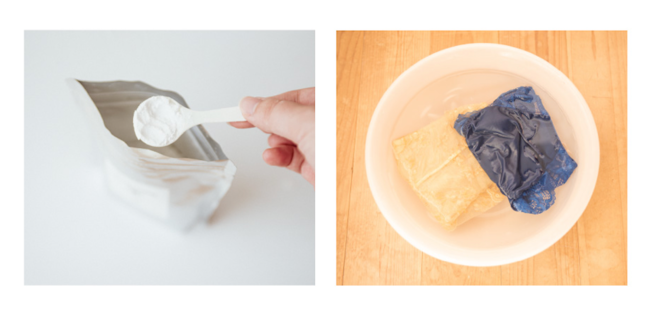 血液にはたんぱく質が含まれており、洗濯の際にお湯を使用すると凝固してシミが落ちにくくなるため、冬でも30℃以下の水~ぬるま湯を使う必要があります。また血液汚れのシミは時間が経過すると酸化して落ちにくくなり、お気に入りの下着にシミが残ってしまう原因となります。「セイリのミカタ 経血用洗剤」は、細かな粉末状のため水に溶けやすく、酵素がたんぱく質を分解してくれるため、つけおきでも汚れをしっかりと落とすことができます。