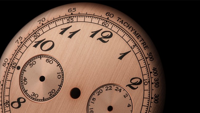 特徴的なブレゲ数字に合わせた、銅色でもピンク色でもないカラーリング。部分的に異なる筋目を用いることによって、奥深い雰囲気を味わえるよう設計されています。