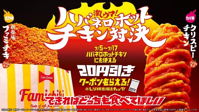 お客さまからご好評をいただいているクリスピーチキンシリーズの大人気フレーバー「ハバネロホット」が、ファミリーマートの看板商品「ファミチキ」にも登場いたしました。”ジュワ辛”の「ファミチキ」と”カリ辛”の「クリスピーチキン」、どちらもクセになる味わいに仕上がっております。