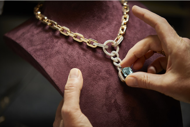 最初のネックレスには、珍しいラグーングリーンの17.9カラットのパライバトルマリンが、二つ目のネックレスには牡丹の花びらを思わせる18.55カラットのソフトピンクのモルガナイトを、三つ目は、15.65カラットのシーブルーアクアマリンをセッティングしています。ネックレスには、7つの個性的なストーンのリングが加わりました。チェーンリンクのリングはローズゴールドのオーバーサイズのベゼルにそれぞれのストーンがあしらわれ、その美しさが際立っています。300~400以上のダイヤモンドが煌めき、センターストーンはそれぞれが約25カラットです。ダイヤモンドが眩いラウンドクラスプがついたローズゴールドのダブルチェーンブレスレットがこのコレクションを完璧なものにしています。