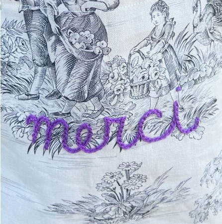 CHICABA × KAORI Embroidery のオリジナル刺繍トートバッグには、フランス伝統の生地「トワルドジュイ」を採用。“merci(ありがとう)”や“amour(愛) ”とフランス語で施された刺繍や、CHICABAのために特別に刺繍していただいた“C”の頭文字もポイント。生地の取り方で1点ずつ異なるバッグの表情や、遊び心のある裏地、“C” の刺繍の色やグログランテープまで、ひとつずつ異なるこだわりのデザインです。