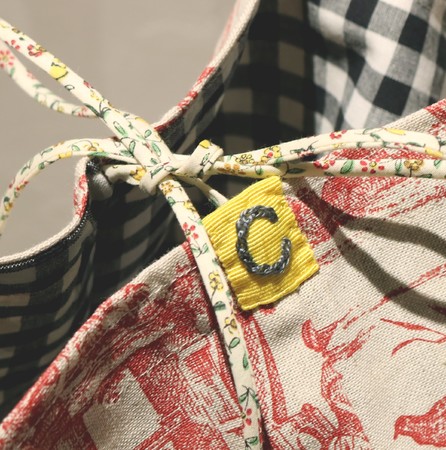 表地のトワルドジュイはもちろん、ちらりと覗くストライプやギンガムチェックの裏地も素敵。CHICABAの“C”の刺繍も、糸やグログランテープの色が1点ずつ異なるこだわりのデザイン。