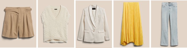 ウィメンズは、オーガニックコットンを使用したショートパンツや、セーターベストをはじめ、従来に比べて水の使用量を20%以上削減する「Washwell™(ウォッシュウェル)」を採用したデニムに注目です。ラグジュアリーな質感が魅力のジャガード生地のプリーツスカートには、リサイクルポリエステルを使用しており、デザイン性の高さだけでなく環境にも配慮した素材を積極的に使用しています。