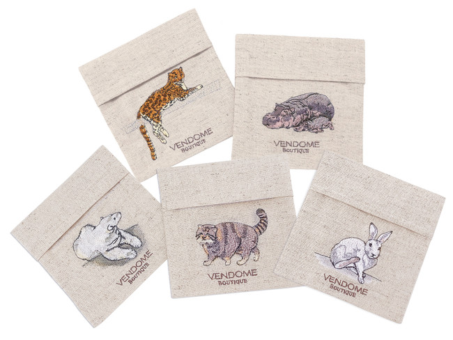 商品はデザイナーによる動物のスケッチ画を刺繍したオリジナルポーチにお入れいたします。