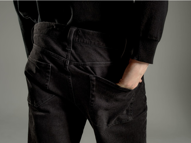通常のデニムパンツに比べてバックポケットを小さく位置を高めに配置することで、ヒップラインをキレイにみせるディテールが施されています。