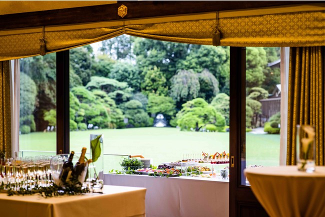 明治記念館(東京都港区元⾚坂2-2-23)より、都心でありながら自然に囲まれ、まるでリゾートにいるようなひとときを過ごせるパーティスタイルを提案します。本プランでは、【食】【ロケーション】【サービス】の3つの魅力にこだわりました。