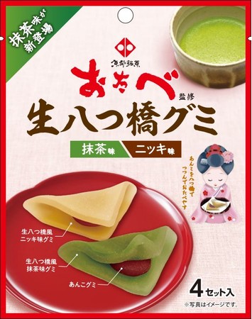 第二弾は生八つ橋の中でも人気の抹茶味が新登場し、今年4月に一部店舗で先行販売されました。ニッキ味のグミ2個・抹茶味のグミ2個・あんこ味のグミ4個が入っているので1袋で2つの味を楽しむことができます。テレビ等メディアにも多数掲載され、既に好評を得ています。