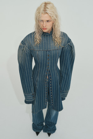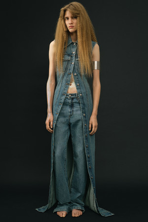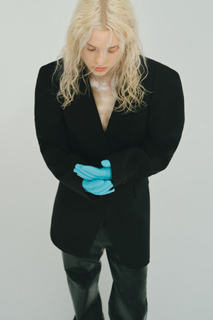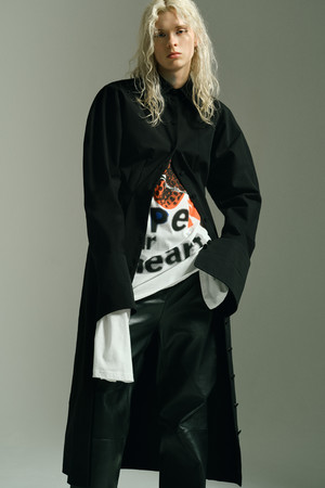 イギリスのシンガーでもありミュージシャンでもあるPJ ハーヴェイは、自由や強さを求め、異議を唱えることを恐れない、枠に囚われない女性です。挑発は決してそれ自体が目的ではなく、知識や自己認識の手段というムード。そんな彼女を意識し、肩が強調されたトラウザースーツを素肌に纏い、シルエットを強調するベルトでウエストを絞ります。