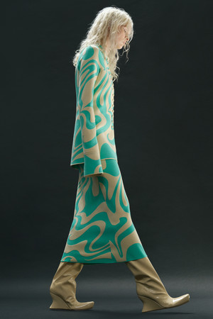 60年代や70年代のサイケデリアは、エネルギッシュな色彩、幻惑的なパターン、身体の曲線をなぞるカーブしたラインが万華鏡のように広がり、紡がれた言葉を歪んだグラフィックの配列へと変えてしまいます。意識はそのような心の変化から、自分自身の知覚を増幅させるように拡大するのです。ポップなグラフィックはファッションへと変換され、オーバーサイズでボリューミーなジャカードニットは身体を包み込み、フレアやスリットで驚きを与えます。