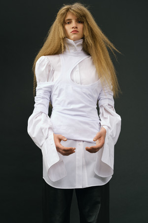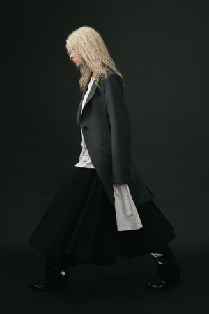 19世紀ヴィクトリア女王時代の厳格な英国は、モノクロームのトーンで書かれた言語と、様々な色調の白と混ざり合う黒の出会いを通じて語られています。落ち着いたハイカラーは小さなラッフルで和らぎ、肘上のブレスレットによりパフスリーブは強調され、スカートは空想的に大きな輪を描きます。