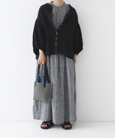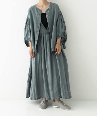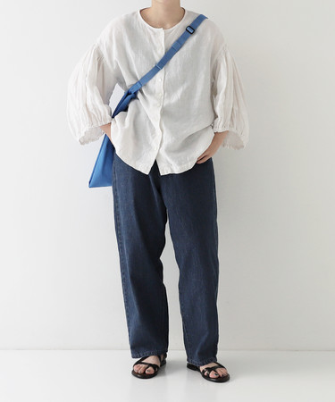 ランタンのようなボリューム感を持たせた袖が特長的なブラウス。袖口にはゴムを通しているので、たくしあげてお好みのシルエットに調節できるのも嬉しいポイント。ゆったりとしたワイドなシルエットなので、風通し良く、涼しく快適に着て頂けます。さらりと1枚でも、釦をあけて羽織りとしても活躍する1枚です。上記のエプロンワンピースとのスタイリングもおすすめです。