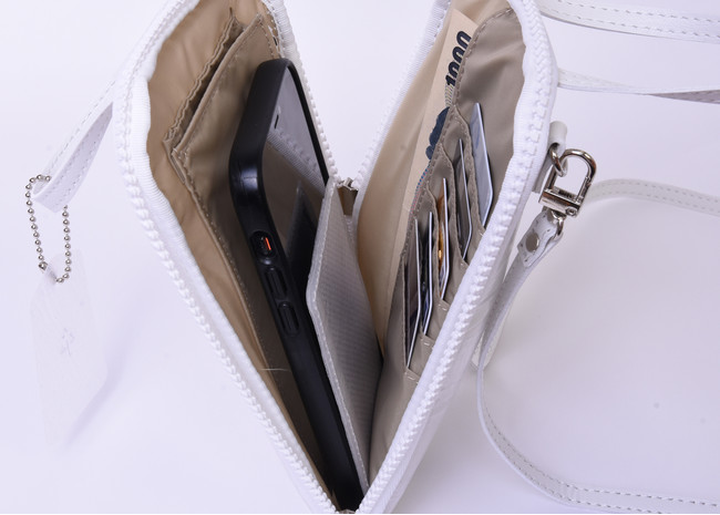 本製品の主要素材として、ビニール傘を解体し洗浄されたビニール部分を、そのままの状態で何層にも重ねて独自の加工方法で圧着して作られた素材を全面に使用しています。また、ショルダーベルトやハンドル等の各部位には、廃棄されたリンゴから作られた植物由来のアップルレザーを採用したショルダーバッグです。内部に入れた中綿により内部を包み込むふっくらとしたフォルムを実現し、ビニール傘素材の防水性により内部のスマートフォンなどを水や衝撃からしっかりと守ります。内部に設置されたカードポケットや小銭入れなどによりお財布の代わりとして、ちょっとしたお出かけに活躍するアイテムです。内装ナイロン、ファスナーにもリサイクル素材を採用し、細かなパーツも環境にやさしい素材で作られたアイテムです。