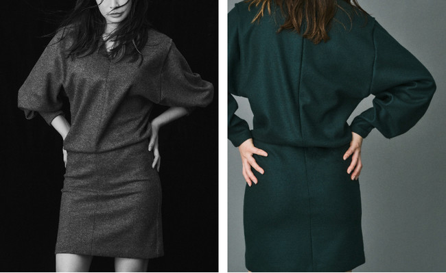 メリハリのあるシルエットが女性らしいワンピース。Vネックがデコルテラインをきれいに見せ、身頃や袖はゆとりを持たせながら袖口を絞ったデザインで、すっきりとした印象に仕上がりました。
