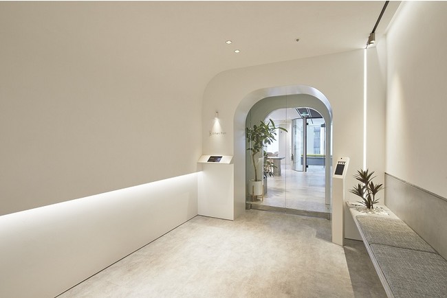 限られた間口で両サイドに柱があり、少し閉塞感があったエントランススペース。柱を隠しアーチを2連にすることで奥行を強調しました。白で統一したシンプルなデザインで、左官で施した天井・壁・ベンチなどの質感や、照明、サインのミニマルさなど細部にこだわりました。