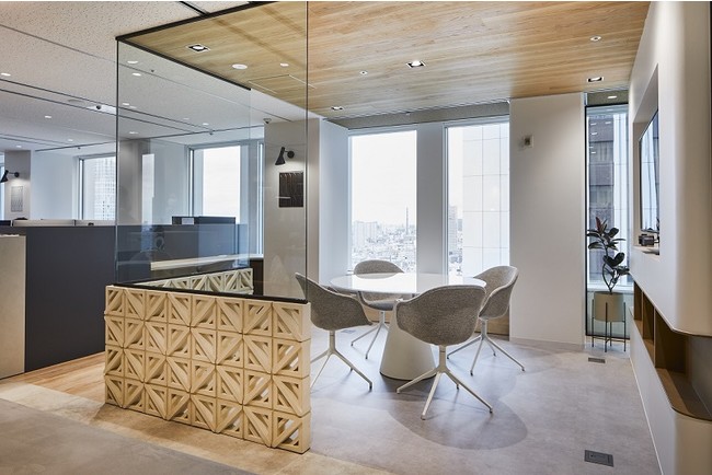 オープンスペースでありつつも、ガラスと特徴的なブロックでコーナーをゆるやかに仕切った空間。窓の景観もあいまって解放感があり、天井の木目がよりリラックスした雰囲気を演出しています。集中したい時に使いやすく、またモニターも設置しており、窓側の造作ベンチやスツールを利用してチーム内でのラフな打合わせやWeb会議も可能です。フラットなコミュニケーションが取りやすく、活発なアイデア出しを促進する円テーブルを採用しました。